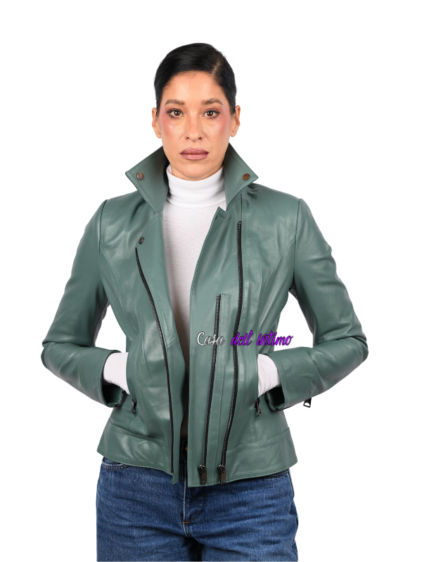 Moderna ženska kožna jakna, klasičnijeg kroja.
