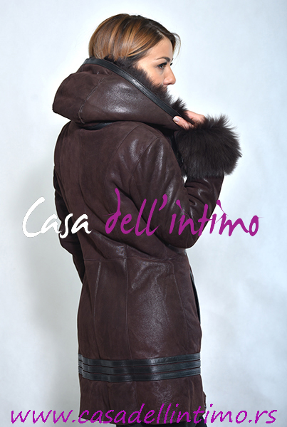 Ženski dugi monton sa prirodnom kožom i krznom. Celokupna unutrašnjost montona i kapuljače je sa prirodnim jagnjećim krznom. Koža je voskirana. Model je blago strukiran i prati liniju tela. Kapuljača se skida, čime dobijate lepu krznenu kragnu.