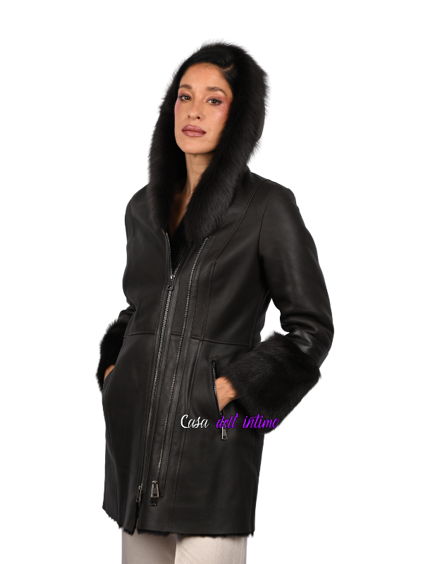 Monton od prirodne kože i krzna, sa kapuljačom.